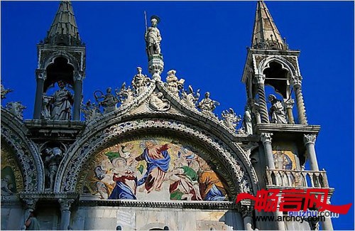 圣马可大教堂矗立于威尼斯市中心的圣马可广场上。始建于公元829年,重建于1043~10711年,它曾是中世纪欧洲最大的教堂,是威尼斯建筑艺术的经典之作,它同时也是一座收藏丰富艺术品的宝库。教堂建筑循拜占庭风格,呈希腊十字形,上覆5座半球形圆顶,为融拜占庭式、哥特式、伊斯兰式、文艺复兴式各种流派于一体的综合艺术杰作。教堂正面长51.8米,有5座棱拱型罗马式大门。顶部有东方式与哥特式尖塔及各种大理石塑像、浮雕与花形图案。藏品中的金色铜马身体与真马同大,神形毕具,惟妙惟肖。教堂又被称之为“金色大教堂”。