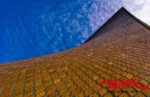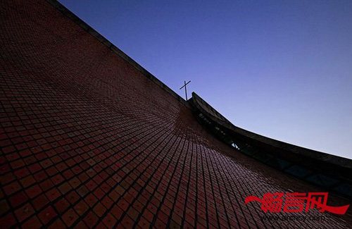 教堂外部覆盖的玻璃菱形砖与蓝天形成强烈反差