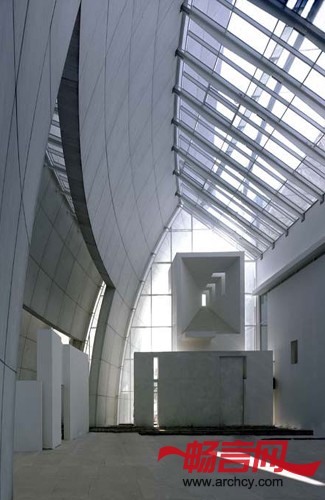 “白”是迈耶的作品给我们的第一印象。尽管白色派的建筑未必白,就迈耶而言,这个称号却是名副其实的,在以色彩浓艳的墙,红黄蓝绿的管线,眼花缭乱的装饰为标志的种种时髦设计面前,他的白色建筑自有一种超凡脱俗的气派。与二战后开始流行的暴露材料本色的设计相反,他做的白色光洁表面具有明显的非天然效果。这就是迈耶建筑的特点,也是他建筑的魅力所在——纯净。然而,纯净不等于单调,精练的设计可以同时是一个富于艺术表现力的设计,如果说密斯(Mise Van der Rohe)后期那些钢加玻璃的大空间给人于冷峻之感,那么迈耶的作品却有另一番情调。
