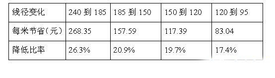 从以上两个表可以看出线径比较大的电缆每降低一个级别,节省的费用是比较大,为此做过一个比较针对此项目一些主干电缆调整后做了计算节省的费用在两百多万。