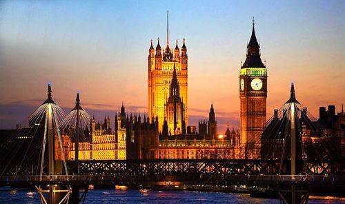 威斯敏斯特宫的屋顶镏金,塔尖高人云霄,庄严典雅。在宫殿南端有巨大而高耸的维多利亚塔,高102米,全石结构,用来存放议会的文件档案,塔楼下面的白家大门只供英王使用。宫殿东北角是著名的钟楼,高97米,打破了宫殿平直的轮廓线。钟楼顶端的“大本钟”是向世界报告标准时间的装置。大钟四面各有直径为6。7米的圆盘,用312块乳白色玻璃拼镶,数十公斤重的时针长2。7米,分针长4。27米,摆重305公斤,总重21吨多。由本杰明爵士监制,故被命名为“大本”。最初,每次上弦要由健壮的汉子用脚连续猛蹬8小时,还要由人拿钢槌击响报时。1913年改装为电动,1923年开始为英国广播公司播送钟声,每天准确报时81次。世界各地收音机收听到的伦敦台钟声便是这个大本钟发出的。