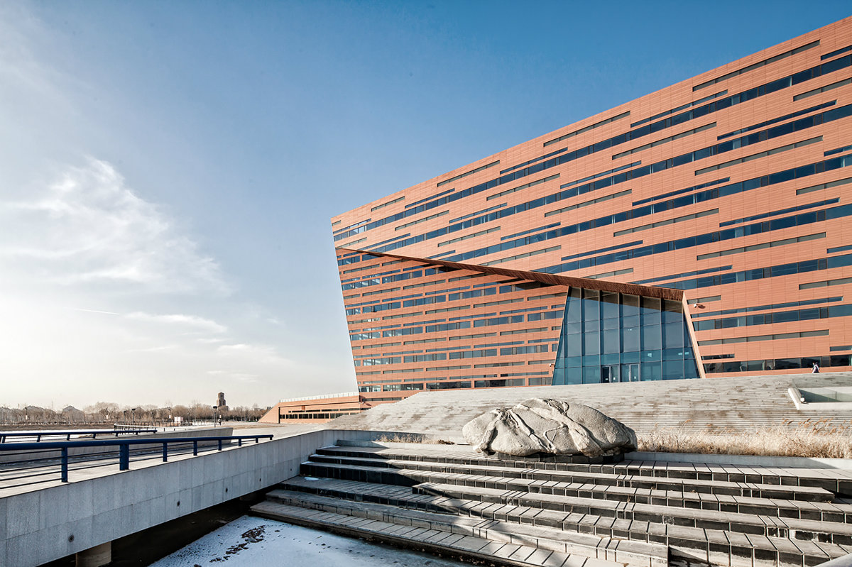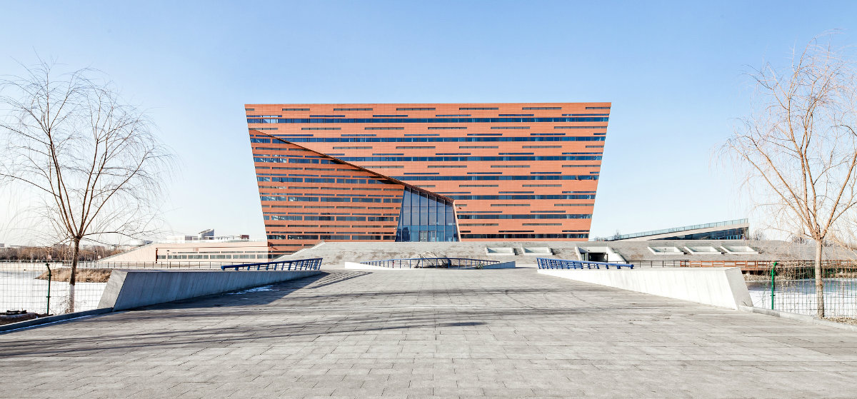 再看早两年建成的“大哥”:由同济院设计的河北工业大学图书馆。项目位于河北工业大学北辰校区中心地块,基地面积约2.8万平方米,新建图书馆总建筑面积4.5万平方米,建筑高度约40米。图书馆以“书山墨海”为主题的方案,2017年工程竣工并投入使用。