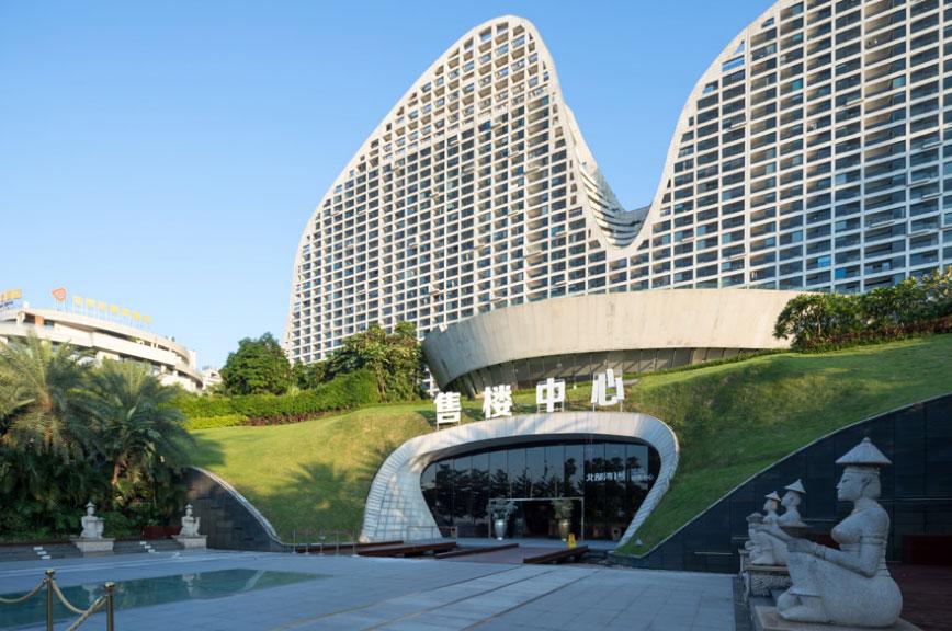 由马岩松设计的北海北部湾一号项目面积达50万平米,包含八座塔式建筑,东侧高达192米的五星级酒店式公寓。项目整体抬高8米,一线海景设计;采用以曲对直手法,自然起伏呈波浪状的园林环境。