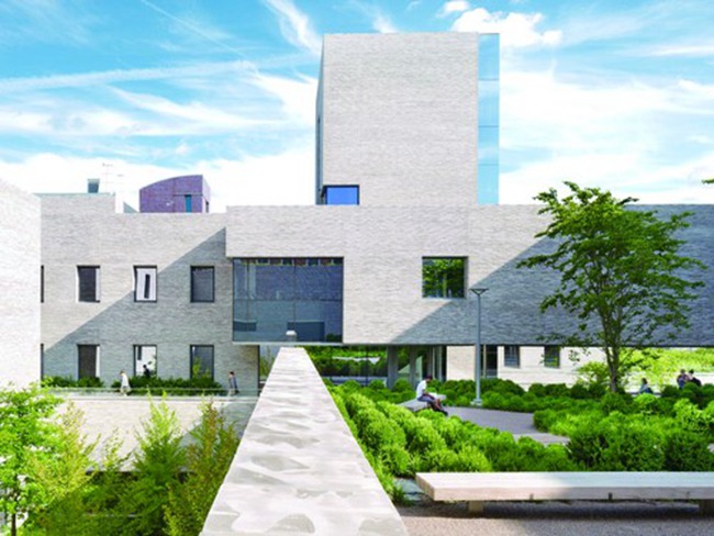 2016年竣工的普林斯顿大学安德林格能源与环境中心,不仅是全面体现TWBTA设计哲学的又一佳作,还是满足美国绿色建筑委员会能源和环境设计标准的绿色建筑。该中心由几个建筑物组合而成,但实际上是一个连续结构,如同冰山一样,超过60%的建筑低于路面。尽管大部分建筑在地下,但大多数建筑空间弥漫着来自下沉庭院和天窗的充足自然光线,让设计处处结合自然。在建筑材料运用方面,安德林格能源与环境中心也独具匠心。为了降低庭院喷砂混凝土挡土墙的粗糙感,他们使用了一种名为Kolumba的浅灰色长条形砖作为建筑外立面。室内的墙面装饰材料,特别是长廊,则运用了一种人造的毛毡墙面材料,有助于软化实验室带给人的冷冰冰的心理感受,让人们体会到一种亲密的社区意识。