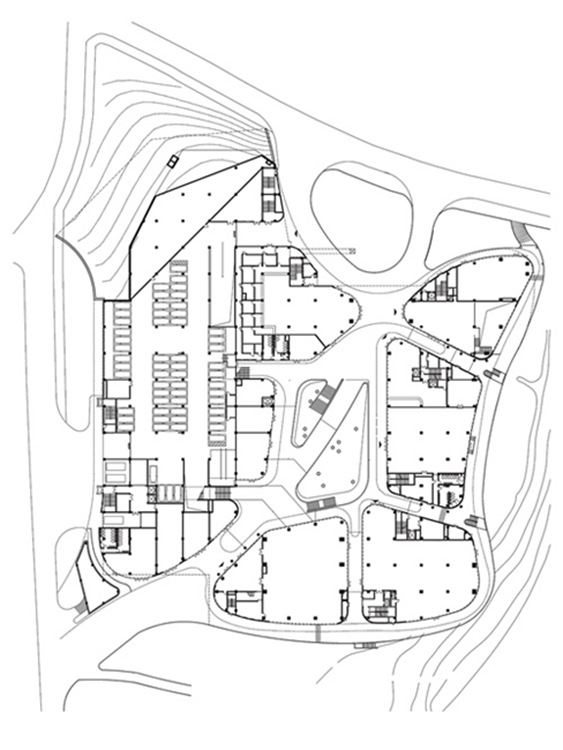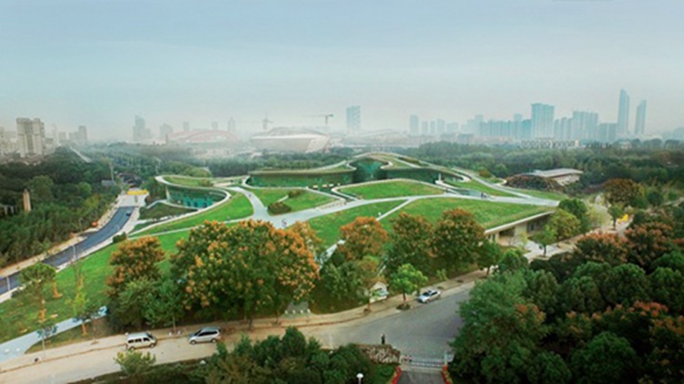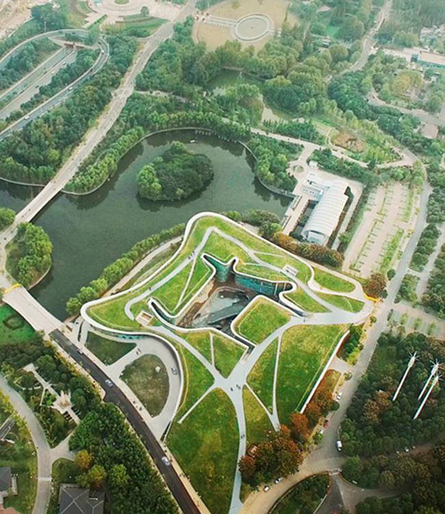 本项目地块位于江苏省南京市建邺区绿博园内,西北侧紧邻长江夹江江堤,东南临绿博园内最大的内湖,本工程作为绿博园的重要景观建筑,是“景观都市主义”理念的重要实践。设计构思将建筑系统与公园系统打通,力求将建筑的大体量整体地藏于景观之下,同时还给公园最多的绿色覆盖,因此,设计理念开始就是一张从地面缓缓掀起的绿色表皮;绿化被带到了空中,而游客也多了一处遥望长江和城市景观的立体公园。同时,该项目也承担了公园目前缺失的人性化复合服务空间,包含了商业、餐饮、酒店、展示等多项功能,同时解决了公园内停车设施不足的现状,既是公园绿化基础实施的一部分,也是交通中转的重要空间节点。
