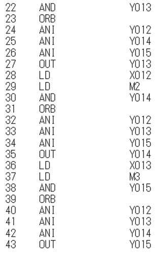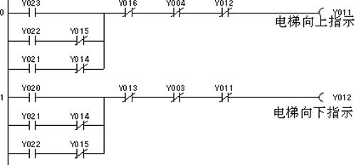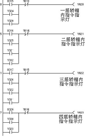 X010,X011,X012和X013分别是一,二,三和四层的接近开关SQ6,SQ7,SQ8和SQ9的输入点,Y012,Y013,Y014和Y015分别是一,二,三和四层楼面的指示灯HL3,HL4,HL5和HL6的输出点。辅助继电器M2和M3起的是单,双层指示灯互锁功能控制。当电梯到达某一楼层后,只有该层电梯的指示灯亮。