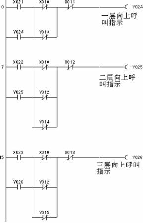 当有乘客在轿箱外的某一层按下呼叫按钮SB7,SB8,SB9,SB10,SB11或SB12中的任何一个按钮后,对应的输入点X018,X020,X021,X022,X023或X024中的某一个就会闭合,同时所对应的层指示灯就亮,指示有人在那一层呼叫,呼叫信号会一直保持到电梯到达该层,该层的接近开关X010,X011,X012或X013中的某一个动作时呼叫信号指示才会消失。