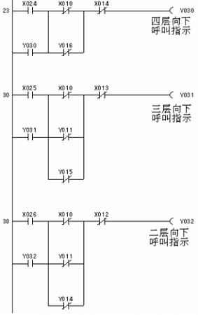 当有乘客在三楼扭动下行旋转开关时,下行旋转开关闭合,X025常开触点闭合,三层呼叫指示输出信号Y031输出有效并自锁,三层呼叫指示灯亮。当电梯向上运行时Y011常闭触点断开同时电梯停留在三层时Y031的自锁功能无效,Y031输出无效,指示灯灭;当电梯运行过程中压下三层接近开关时,其常闭触点X013断开,Y031输出也无效。