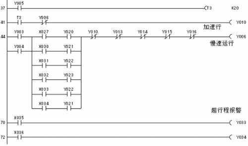 当电梯在向上运行或向下运行时,电梯超出行程,会压下行程开关SQ16或SQ17,常闭触点X035或X036断开,电梯启动程序停止,同时常开触点X035或X036闭合,Y033或Y034触点闭合,报警电路输出有效,报警灯闪亮。