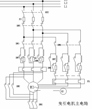 设计思路:曳引电机正转时,KM3闭合,当KM7,KM5触点闭合,电机加速运行,此时串联电阻和电抗的支路电流逐渐增大,当速度达到要求后,KM7触点断开,电梯快速运行;当电梯压下层接近开关时KM6触点闭合,电路电流突然增大,根据电抗的反抗特性,电路电流反相流通,电机反制,速度降低,降到一定时由速度继电器起作用,电机停转,达到电梯停车的要求。
