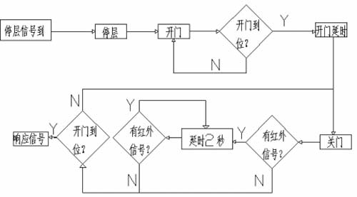 当停层信号到达时,电梯停层,门电机正转,轿箱门打开,系统等待开门到位信号到达,接受到信号后,箱门保持打开延时状态;开门延时完毕后电梯开始关门,首先判断有无红外信号,若有,电梯延时2秒,没有信号则继续关门,直到关门到位,然后响应接下来的信号。