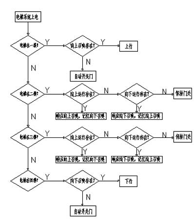 电梯系统上电后,系统首先判断,电梯处于哪个楼层,若电梯处于一楼,然后判断电梯是否有向上召唤信号,若有响应信号,若没有,则保持电梯门关闭状态。
