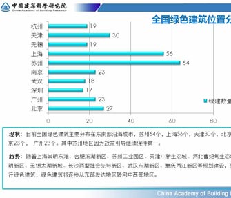 目前全国绿色建筑主要分布在东南部沿海城市,随着上海崇明东滩、合肥滨湖新区、苏州工业园区、天津中新生态城、河北曹妃甸生态城、深圳光明新区、无锡太湖新城、长沙两型社会先导新区、武汉东湖新区等规划建设,强制要求执行绿色建筑,绿色建筑将逐步从东部发达地区转向中西部地区。 |