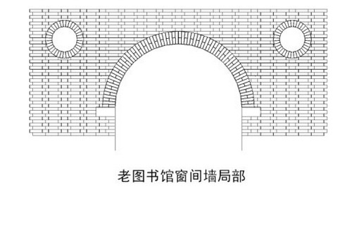 关先生主持的图书馆的第二次扩建,注意了与以往的建筑的协调和文脉的延续。首先,他将砖砌的拱券发挥到极致。在二校门和清华学堂的入口以及二教的窗洞上均为拱券,大礼堂北立面上部还有一巨大的砖发券直到顶部,老图书馆的窗洞已经是三层退迭的砖券了。在新图书馆与老图书馆交接的部分,做了连续券廊。券廊内部的墙面上、门洞顶部和假窗部分的墙面砌筑图案明显延续了大礼堂和一号楼、新斋的墙面的砌筑图案,分别见图10一11。