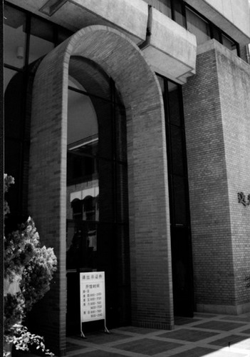 更引入注目的新图书馆入口处的巨大的异形券洞,它紧贴入口的大片玻璃幕墙外侧,呈向外张开式。由于它壁薄且是又深又高,故已不能用砖砌筑来实现,只能做成混凝土构件,外贴砖红色面砖,见图13。拱券在砖砌建筑中得到普遍喜爱,这是因为拱券最能发挥砖的优点,表现砖的结构之序,是砖不可或缺的基本特征,正如路易•康所说的: