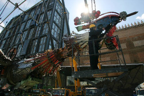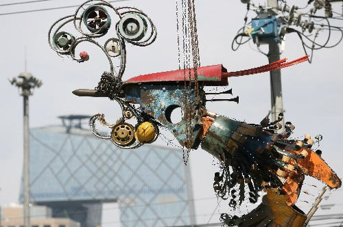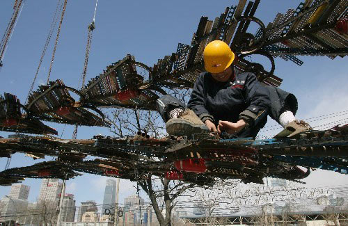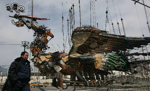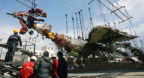 3月25日,工人在北京用建筑废料拼装成凤凰的形象,它们将于4月中旬被运至上海世博会中国馆的主题大厅。