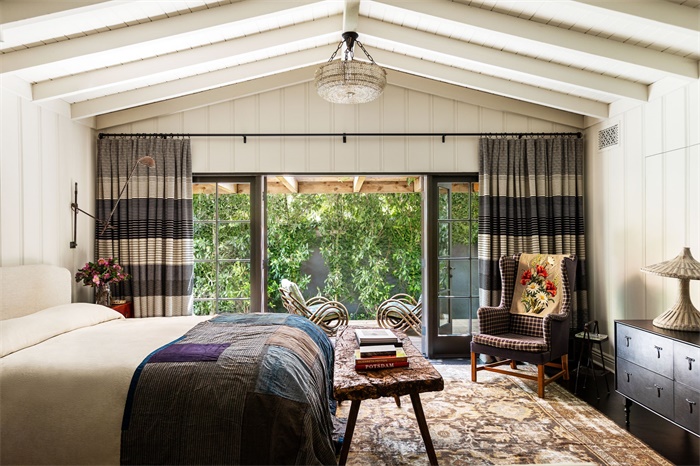主卧延续整体舒适自然的设计主题,简单的白色搭配棉麻材质的床铺。夺人眼球的床尾凳,搭配羊毛软包的床。主卧里这张化妆桌,帆船吊饰也是从二手市场淘来的。