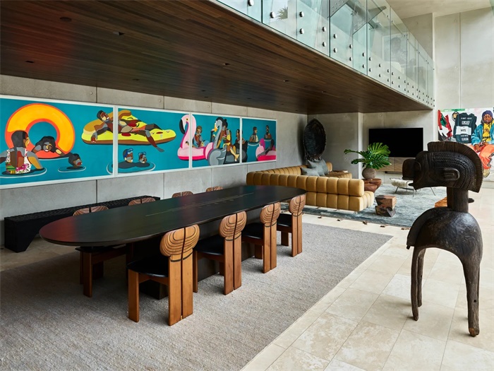 家庭娱乐室内有一张定制的长餐桌,墙上挂着 Derrick Adams 艺术画。