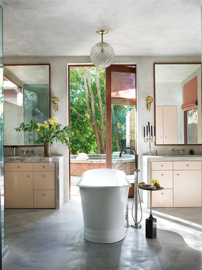 Dakota重新装修了整个主卫生间。因为她个人对于颜色十分讲究,当设计师找不到这个色调时,她提供了一件“The Row”的毛衣作为参考色。她对主浴室的要求是要有一个大浴缸,“蜡烛,书,盐浴,每天晚上都可以享受放松。”