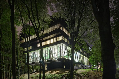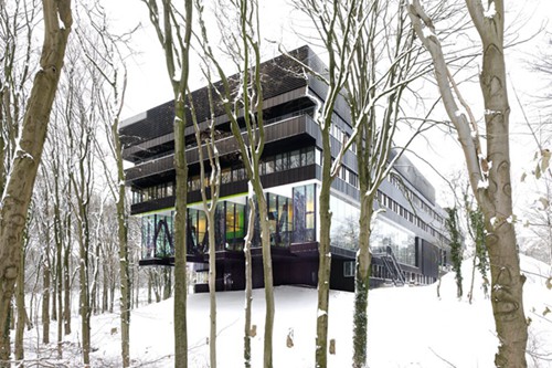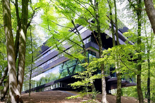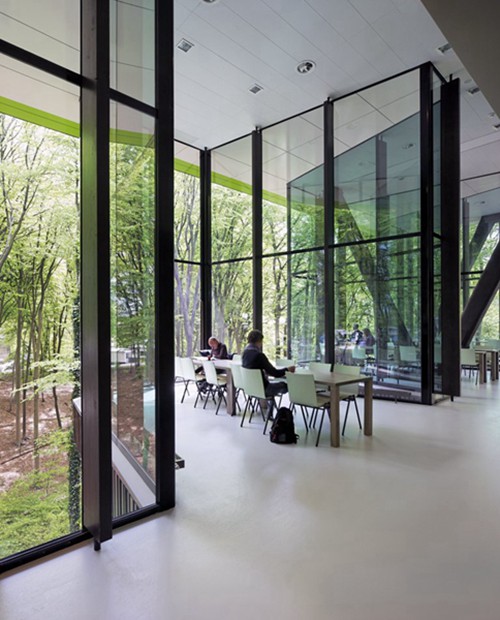 在荷兰东部阿纳姆的森林中,一块安静的用地上屹立着这座疗养院。虽然这个14000平方米的建筑占地面积不大,但是通过悬挑获得了足够的空间,铝金色的外皮与自然环境也相当搭。通透的玻璃与环境的无缝连接。森林触手可及无处不在,对建筑中的人形成强烈吸引。疗养院也是公园总体规划的一部分。一二层可以理解成一个公共景观。