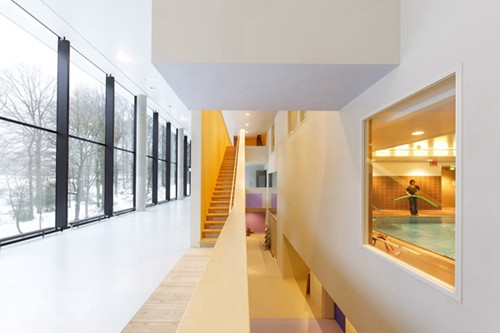 建筑散发着自信和高效的气质。这是一个友好,开放,可在原生自然环境中活动的疗养之地。这建立在建筑师与客户的良好沟通。比如一个木楼梯设置,形成了新的动线,有利于不同楼层间的交通,让在建筑里漫游有更多的选择性,同时可以达到锻炼的效果。天井和各种挑探形成多重空间,并使得自然光深入建筑30米进深。微妙,醒目的色彩和光照让空间异常活泼。