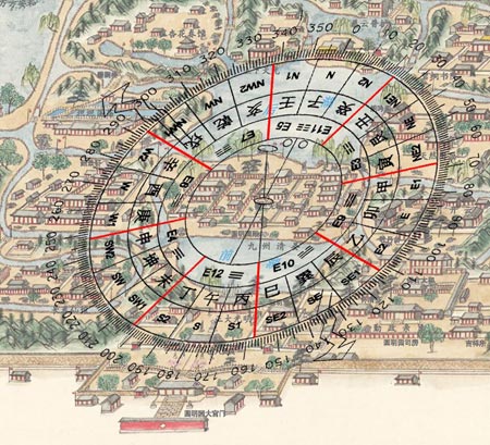 相传大禹治水之时,有神龟背上背负着数字浮出水面,龟背上的数字就是后世传说中的《洛书》,也叫“龟图”。那些数字据说就是后来八卦的起源。龟图代表了华夏大地,这和“九州清晏”这片圆形建筑的名称不谋而合,莫非这片奇特的建筑就是对龟图的一种写意的表现?