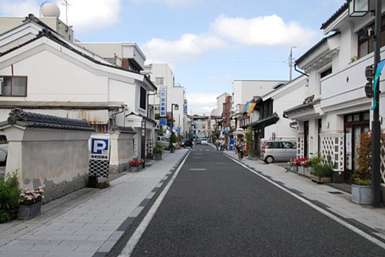 隔着女鸟羽川,与中町大街的仓房建筑景观相对的是再现了城下町景观的绳手大街。1967年,这里开始祭祀青蛙大明神,青蛙的发音在日语中与“回来”相同,祭祀青蛙含有希望再次恢复活力的含义,这里也成为市民和游客小憩之地。