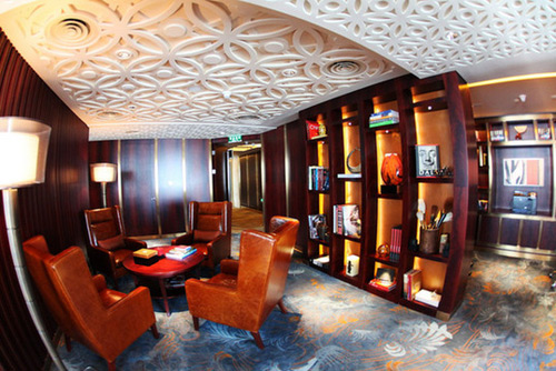 主楼大厅极尽奢华,墙体上是仿古的窗棂造型,密布的方形装饰上贴有24K金箔,另一面玻璃隔墙上贴满数百个打磨成圆形的石子,与大厅的金碧辉煌相映成趣,大厅四个水晶灯据称从捷克进口,价值不菲。