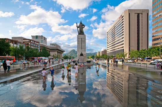 光化门对面的世宗广场上屹立着韩国民族英雄李舜臣和创建韩国文字的世宗大王的铜像