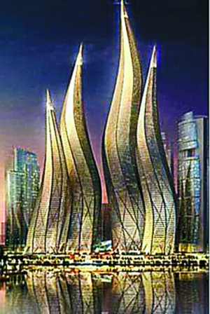 风中火烛大厦由四座高度不等的大厦构成。分别从54层到97层不等,汇集在一起构成一座舞蹈般的雕塑形象,看上去像是烛火在闪动。