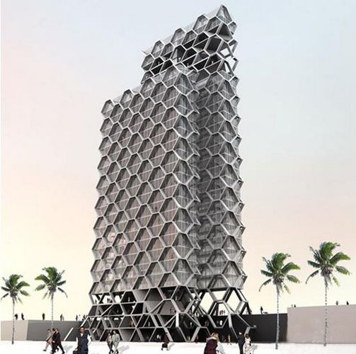 Rojkind Arquitectos主持人Michel Rojkind以无数个六角形作为结构包覆串连了两座楼体,同时也作为玻璃帐幕的支撑框架,蜂巢状的架构暗示了现代人们居住的形态终究回归到大自然生物的运作,由底层分散的状态逐渐往上聚集,由公共空间渐变至私人空间。