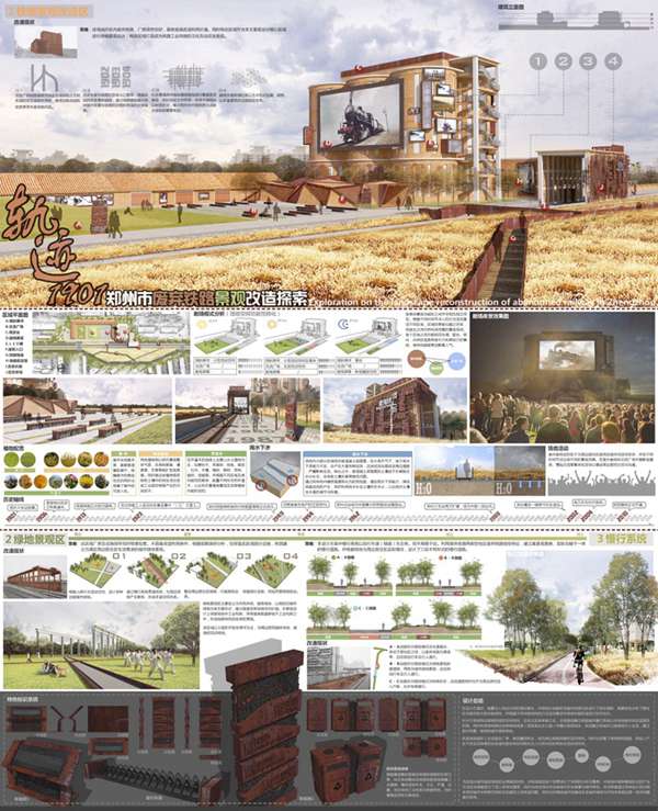 作品介绍:随着我国经济的飞速发展,我们的城市在不断的向外扩张。在城市扩张的过程中,市区内一些废弃土地却并未得到合理利用,成为城市的灰色地带。相对于传统类型城市废弃地,线性特征明显的城市铁路废弃地景观改造则具有更高的难度与要求。设计以郑州市一段废弃铁路作为对象,对场地区域城市规划、场地环境等问题进行分析,并结合场地特定空间构成形态提出铁路景观改造、城市绿地系统、城市慢行系统三个层面的景观改造方案。在深入理解场地的情况下对以城市废弃铁路为代表的城市线性废弃空间的进行景观改造、利用的初步探索。