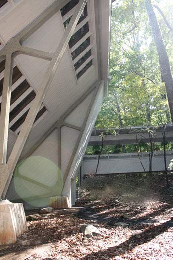 在参观了停车场后,凯恩带着我们来到了他设计的办公楼。这座办公楼最大的结构特点是,朝南的外墙面与地表不是垂直角,而是成45度的仰角。问到其中的玄机,凯恩答到,由于亚特兰大属于亚热带气候,当地夏季较长,阳光照射强烈,这种角度可以最大限度的避免阳光直接照射,减少制冷空调的能耗。办公楼另外一个显著特点是楼中间部分的下方离地面约两米高度,由若干根斜拉钢梁支撑,造型新颖,线条明快,建筑物下面是原生态的地表土及松软落叶。问及这种结构的功能时,凯恩解释道,由于办公楼建在山坡上,所在地域属于当地水系的水源涵养地,坡下是亚特兰大当地最为重要的河流――洽塔库琪河(ChattahoocheeRiver),水质和水系的保护非常重要,这种结构可以最小限度地影响地表径流及自然水系,保证降水充分自然地流入下河。