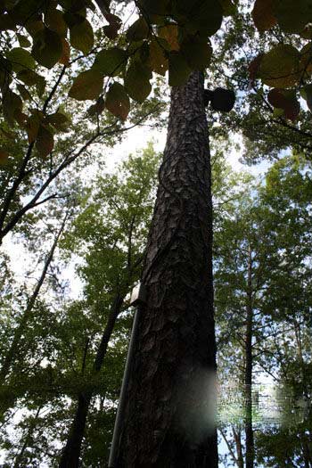 “这里也需要夜间照明,你们看到电线杆了吗?”在停车场里,凯恩问。我环顾四周,没有发现一个电线杆。凯恩抬手一指,原来照明灯具架在了一颗粗大的松树上,顺着松树的背后,是一根PVC管裹着电线,延伸到地下,PVC管上,早已布满了青苔。这样不会影响树的发育吗?凯恩诙谐地说,会的,不过,这么高树龄的树,二十年主杆不会长过半英尺的。立一根电线杆,成本当时要4000美元,将照明架在树上,成本不足500美元,业主对这个创意非常满意。凯恩又低头指着一堆动物粪便说,这是当地野生白尾鹿的粪便,这里由于没有过多的改变自然面貌,停车场及办公楼周边还经常有鹿、獾等野生动物光顾,活泼可爱的小松鼠更是随处可见。