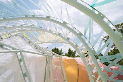 建筑师说,这个设计的灵感还来自于伦敦地铁几乎无法控制的混乱,当参观者在多层的塑料薄膜中穿梭并试图弄清每条通道是如何连接的时候,他们这个扭曲的隧道就会有一种管道迷宫般的疯狂感觉。这个地方因为参观者而变得热闹起来,光影交错,就好像公园生活变成了珍珠般的海市蜃楼。到了晚上,它又变成一个梦幻般的外星萤火虫。
