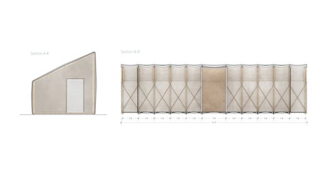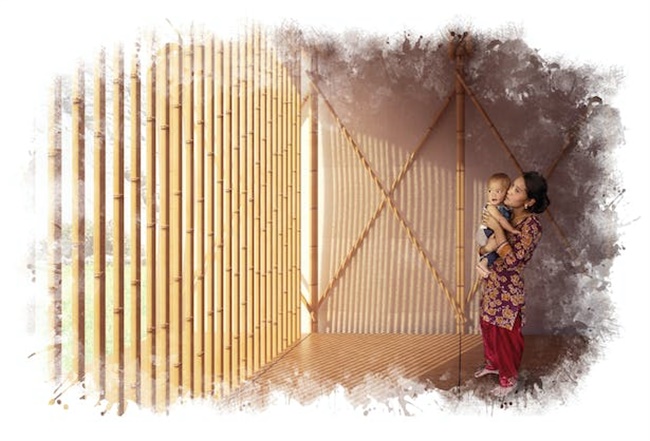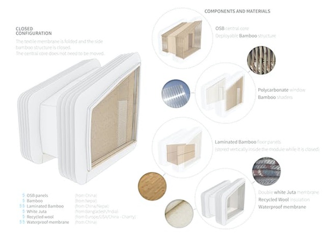 项目理念是使用尼泊尔当地材料,实现可快速建造、轻便紧凑、便于运输、耐用(尽管是临时性的)且经济的房屋。使用由竹子和纺织品建筑围护结构制成,结构可展开,允许运输,空间可封闭,占地面积2.5 x 4米,打开可达4 x 7.11米。房屋制造不需要复杂技术或熟练的劳动力,只需要一系列简单的操作,就可以将各种部件组装起来。结构模块化方便分阶段施工。例如,竹子模块可以由团队准备,第二个团队可以准备中心芯,其他团队可以处理织物封套。部分部件可预制,预加工,加快组装过程。