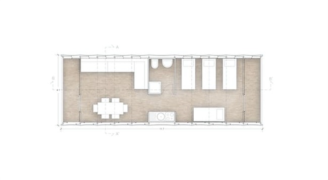 房子中心有一个永久构件,由可覆盖的木质OSB板制成,配备浴室和厨房,尺寸为1.5 x 4米。在中心区域两侧,布置了两个主要房间(起居室和睡眠区),尺寸为4 x 4米,加1 x 4米的小型有屋顶的室外区域。两个房间由直径为6厘米的水平、垂直、和倾斜竹竿组成,直径为3厘米的X形竹竿支撑。竹竿中心和末端钻孔,以便使结构展开。展开后,通过蝶形螺钉实施固定。