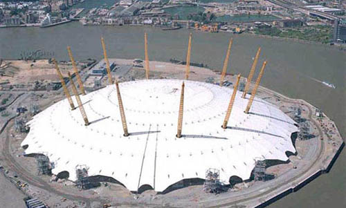 膜结构是建筑结构中最新发展起来的一种形式,它以性能优良的织物为材料,或是向膜内充气,由空气压力支撑膜面,或是利用柔性钢索或刚性支撑结构将面绷紧,从而形成具有一定刚度、能够覆盖大跨度空间的结构体系。自从1970年代以来, 膜结构在国外已逐渐应用于体育建筑、商场、展览中心、交通服务设施等大跨度建筑中。膜结构已成为结构设计选型中的一个主要方案。成为化纤纺织品应用的一个重要领域。近年来在中国建筑 结构中也有长足的进展。 大阪万国博览会中的美国馆采用了气承式空气膜结构。这个拟椭圆形、轴线尺寸为 140m×83.5m的展览馆是世界上第一个大跨度的膜结构,而且是首次采用了聚氯乙烯(PVC)涂层的玻璃纤维织物。作为一种真正的现代工程结构,大阪万国博览会的展览馆标志着 膜结构时代的开始。自此以后, 膜结构在世界范围内得到了迅猛的发展。从跨度来说,美国庞提亚克的"银色穹顶"气承式空气膜结构的平面有234.9m×183m,开始采用聚四氟乙烯(PTFE)涂层的玻璃纤维织物,类似的大型体育馆在北美就建了九座。从面积来说,沙特阿拉伯吉大机场候机大厅的悬挂膜结构占地42万m2。作为 膜结构一种新形式,索穹顶于1988年首先用在汉城奥运会的体操馆与击剑馆,其后又在一些体育建筑中得到推广。千年穹顶以其独特的膜结构,显示了当今建筑技术与材料科学的发展水平。