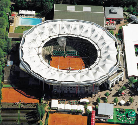 德国汉堡网球场膜结构展开面积约10000平方米,采用PVC(PVDF面层)膜材,并且选用能够满足要求的最薄的膜材型号。屋盖是可开合式的膜结构,可缩进的膜结构棚盖可以在任何恶劣的天气时,将棚盖关上;在天气转好时打开。以确保在任何季节里网球比赛的举行,或避免时重要的赛事中断或延迟。