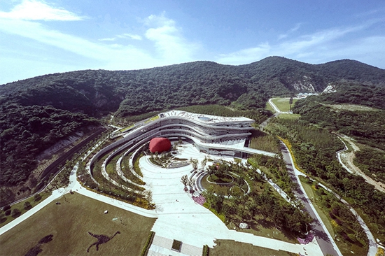博物馆的核心设计理念来源于建筑所坐落的场地,一个废弃的依山而立的旧窑厂。废墟般的挡墙和其后叠嶂起伏的山峦赋予建筑形态创作的灵感,整个建筑借用地貌学的概念,在此通过引入一系列人工等高线的概念来构筑一个经过抽象过的人工地貌,似乎尝试复原被砖窑厂所改变的原始地形。一系列起伏、流动的线条仿佛从地面上生长出来似的,它们仿佛将千百年来地貌的运动、变迁,地层的摩擦、碰撞、破裂、挤压与移动的瞬间凝固下来一样。当人们凝视着这座流畅变幻,充满浪漫动态的建筑形态,似乎在与汤山过往这片经过亿万年发生过的地质变迁场景之间的对话。建筑的视觉形象准确反映了以地质和人类学为主题的博物馆的内涵。而犹如碰撞中的地质运动而催生的起伏变化的形态,也暗合基建筑所处的方山地质公园的地理地貌特征。建筑仿佛在时间的长河中凝结而成的地质变化的化石,记录着人类和地理变迁的沧海桑田。建筑与景观之间连续性的处理创建了建筑与场地之间有序的时空连接,建筑成为大地景观的一部分。