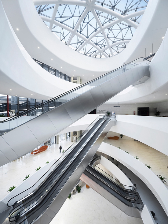 室内空间的组织以贯穿四层博物馆的中庭为核心,每层中庭洞口的形状不同,相互交叠,从这些洞口贯穿看过去仿佛在探索一个垂直溶洞,充满神秘和好奇的空间氛围,营造出奇妙的欢迎访客公共空间,拉近了博物馆与普通公众之间的距离。而纵横交叉在这些中庭洞口的自动扶梯的引入似乎与传统博物馆大相径庭,不仅打破以往博物馆殿堂般庄严宏伟的格局, 也有力的刺激和引导游客竖向人流的动线,加强博物馆上下楼层之间的联系。当代博物馆已经不仅仅局限于展陈的单一功能,而是结合教育,旅游,休闲,聚会,互动等全方位体验的新型当代复合功能的公共空间,使得该博物馆成为其所承担的社会功能的最佳诠释。新颖独特的外部建筑形态与内部空间组织构成了引人入胜的场所,引导游客们前来参观,从而在自然而然地过程中感知和了解地质与人类变迁的自然历史。