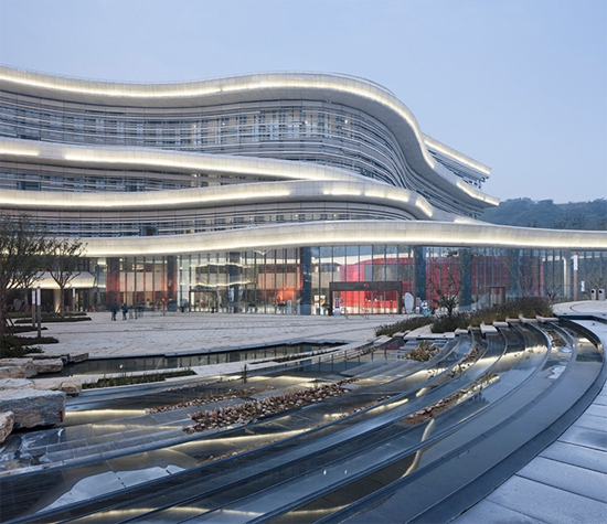 这些上下起伏舞动的人工等高线,不仅仅在视觉上承载着设计的核心理念,而且也构建出丰富的竖向外部景观平台。当人们沿着这些从地景中延伸绵延,盘旋升腾的坡道到达不同高度的室外平台,仿佛在攀登一座人工山体,为游客提供了丰富的外部空间体验,也探讨一种积极的人对自然观察和理解的相互关系,而同时这些室外平台、台阶和坡道也作为消防疏散的路径之一。