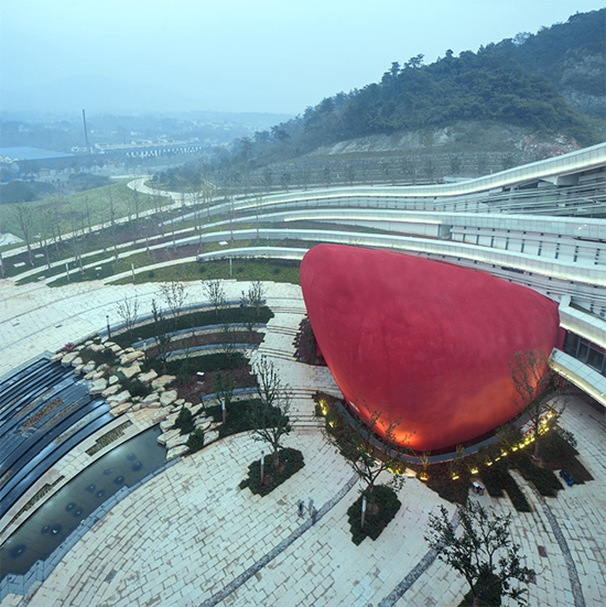 在立面处理上GRC水平构件所形成的丰富变化的肌理,也似乎在还原地貌亿万年的变化所塑造成的不同地质年代沉积的痕迹。在具体处理上采用玻璃纤维强化混凝土(Glassfiber Reinforced Concrete)和天然石材两种材料为主,GRC板材表面处理成类似斧凿石材表面肌理,色调则在对比附近山体颜色的色彩,经过多次反复尝试最后确定接近场地山体的色调。作为工业化材料的GRC具有很强的可塑性和适应性,既能够出色的满足建筑多方向曲面造型的要求,同时还能够匹配天然石材所具备的对环境的敏感和细腻的特点,在建筑材料的选择上也力图保持人工与自然之间精妙的平衡。