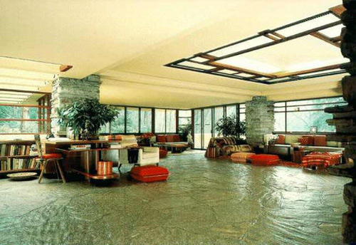 流水别墅是赖特为考夫曼家族设计的别墅。在瀑布之上,赖特实现了“方山之宅”(house on the mesa)的梦想,悬的楼板锚固在后面的和自然山石中。主要的一层几乎是一个完整的大房间,通过空间处理而形成相互流通的各种从属空间,并且有小梯与下面的水池联系。正面在窗台与天棚之间,是一金属窗框的大玻璃,虚实对比十分强烈。整个构思是大胆的,成为无与比的世界最著名的现代建筑。