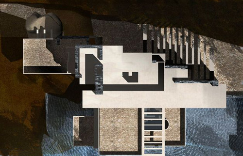 在这里,并不只是用围合空间来限定建筑形式,形成空间体验,更重要的是这些空间介于建筑与建筑、建筑与环境之间——走道、桥、平台以及台阶。感觉把握光线、质感、材料以及被石头和水乃至高处的树林所限定的空间的通透感。