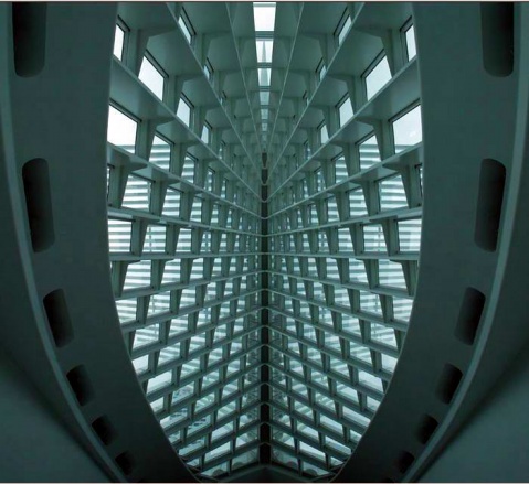 门厅以内的室内空间,更是几乎通身纯白的格局。在密尔沃基美术馆里,卡拉特拉瓦以厚重的混凝土拱作为基本元素反复叠加,沿着南北轴线不断向北伸展的展览空间,都归结在了遵循结构规则的绵长韵律中。最简单、最朴实的结构功能,造就了极其雅致而壮丽的美。由于混凝土的拱远远伸出的远端正好为展廊托出了檐口,因此展廊里能照得到的,基本上只是室外地面反射回来的漫射光,既能保证足够的自然采光,又避免了阳光直射对艺术藏品的破坏。