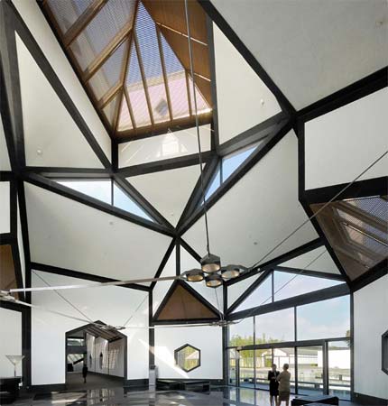 尽管白色粉墙成为博物馆新馆的主色调,以此把该建筑与苏州传统的城市机理融合在一起,但是,那些到处可见的、千篇一律的灰色小青瓦坡顶和窗框将被灰色的花岗岩所取代,以追求更好的统一色彩和纹理。博物馆屋顶设计的灵感来源于苏州传统的坡顶景观一一飞檐翘角与细致入微的建筑细部。然而,新的屋顶已被重新诠释,并演变成一种新的几何效果。玻璃屋顶将与石屋顶相互映衬,使自然光进入活动区域和博物馆的展区,为参观者提供导向并让参观者感到心旷神怡。玻璃屋顶和石屋顶的构造系统也源于传统的屋面系统,过去的木梁和木椽构架系统将被现代的开放式钢结构、木作和涂料组成的顶棚系统所取代。金属遮阳片和怀旧的木作构架将在玻璃屋顶之下被广泛使用,以便控制和过滤进入展区的太阳光线。