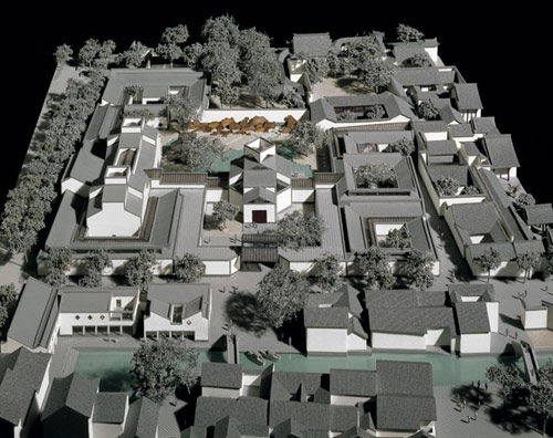 这种在城市机理上的嵌合,还表现在东北街河北侧1~2层商业建筑的设计,新馆入口广场和东北街河的贯通;亲仁堂和张氏义庄整体移建后作为吴门画派博物馆与民族博物馆区相融合,保留忠王府西侧原张宅“小姐楼”(位于补园南、行政办公区北端)作为饭店和茶楼用等;新址内惟一值得保留的挺拔玉兰树也经贝先生设计,恰到好处地置于前院东南角。