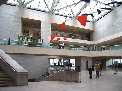 展览馆美术馆馆长J.C.布朗认为欧美一些美术馆过于庄严,类若神殿,使人望而生畏;还有一些美术馆过于崇尚空间的灵活性,大而无当,往往使人疲乏、厌倦。因此,他要求东馆应该有一种亲切宜人的气氛和宾至如归的感觉。安放艺术品的应该是“房子”而不是“殿堂”,要使观众来此如同在家里安闲自在地观赏家藏珍品。他还认为建筑应该有个中心,提供一种方向感。为此,贝聿铭把三角形大厅作为中心,展览室围绕它布置。观众通过楼梯、自动扶梯、平台和天桥出入各个展览室。透过大厅开敞部分还可以看到周围建筑,从而辨别方向。厅内布置树木、长椅,通道上也布置一些艺术品。大厅高25米,顶上是25个三棱锥组成的钢网架天窗。自然光经过天窗上一个个小遮阳镜折射、漫射之后,落在华丽的大理石墙面和天桥、平台上,非常柔和。天窗架下悬挂着美国雕塑家A.考尔德的动态雕塑。