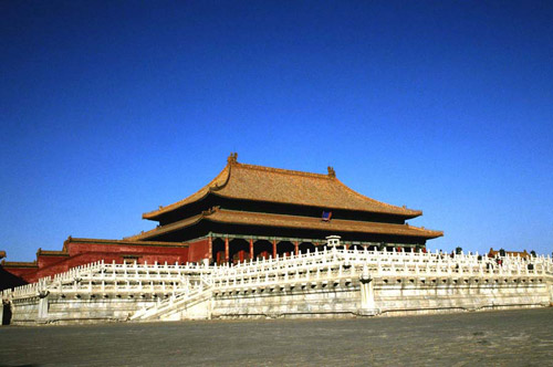紫禁城前半部(南半部)以太和殿、中和殿、保和殿三大殿为中心,东西辅以文华、武英二殿,统称为“外朝”,是明、清两代皇帝办理政务、举行朝会及其他重要庆典的场所。三大殿建于高8.13米的3层汉白玉石台基上。其中太和殿面积2370平方米,高33.33米,重檐庑殿黄色琉璃瓦顶,是现存中国古代建筑中最高大的建筑,是封建皇权的象征,皇帝登极、万寿、大婚、册立皇后等均在这里举行。保和殿顶为重檐歇山式,殿内沿袭宋、元“减柱造”法式,空间开阔,在清代是宴请王公、举行殿试等的地方。
